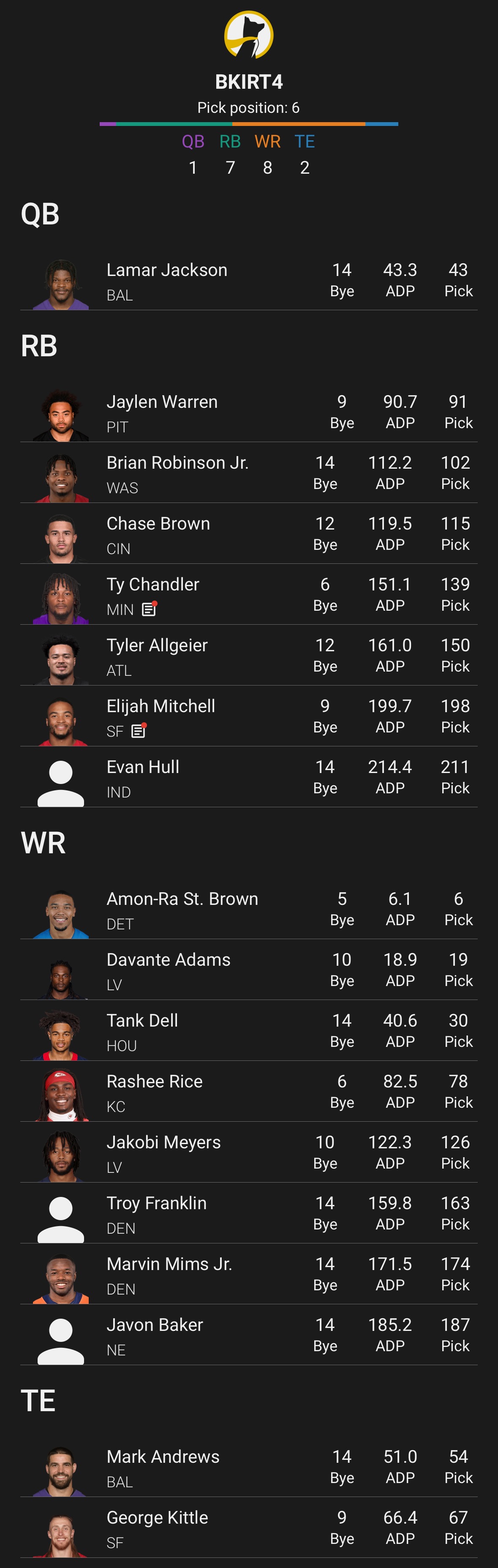 Bye Week Duplication – It is very possible you end up with both players at a onesie position with the same byes (ex. Mark Andrews and Dalton Schultz), this is the cost of doing business.