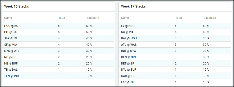 Week 16 / Week 17 Game Stacks