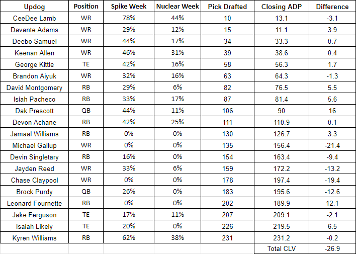 Lets also take a quick peek at the second place team. It was a Zero RB structure with a roster build of 2-7-8-3 scoring 2,789.74 points. We can see overlapping players of CeeDee Lamb, Dak Prescott, Leonard Fournette, Jake Ferguson and Kyren Williams. Yes, you read that correctly, the top two teams both rostered Uncle Lenny. The Dallas Cowboys team stack who greatly overachieved their draft slots were the key to success plus Kyren Williams. Interestingly enough, this team was also a CLV loser. While I personally do believe CLV is a good thing, drafting good players is also a good thing. A sample size of two is far too small to deem predictive, but is a good reminder that when we are drafting Best Ball teams things like stacking may supersede getting CLV. Tank Dell was crucial to the winning team and Brock Purdy to second place.