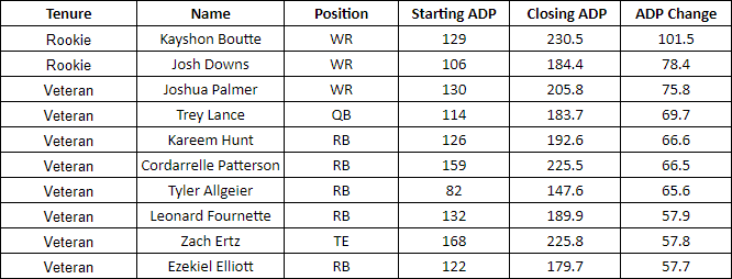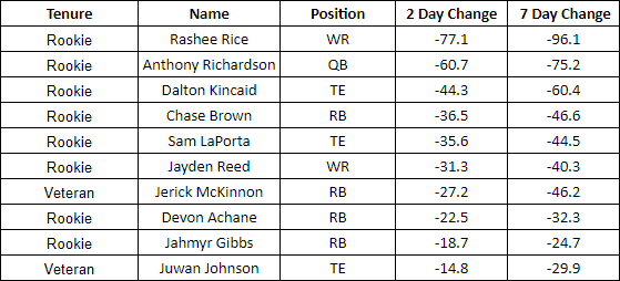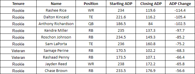 The top 10 largest ADP movers over a 2 day period happened the first 2 days of the tournament. The top 9 largest ADP movers over a 7 day period happened the first 7 days of the tournament. These are almost all rookies too! What does this mean? Get in this contest early and often at launch to build player combinations that will not be available later in the summer.