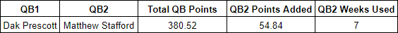 Did the second quarterbacks add value to the teams? Yes, just barely. Dak plus Stafford was the 144th highest possible two quarterback combo, with Stafford adding 54.84 points to the team. This was probably the most vulnerable position on the winning team with as Dak plus Stafford was the 17th best Dak pairing. Solo Josh Allen scored more points, even Jalen Hurts plus Jameis Winston scored more points.