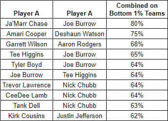 For fun, lets look at the highest rostered two player combinations from the bottom 1% of teams.