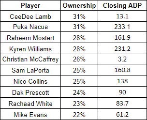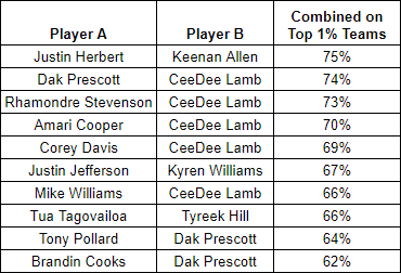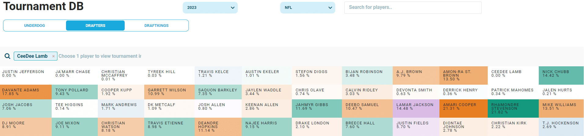 A glance at TournamentDB shows us that Ceedee Lamb was almost never combined with either Josh Allen (0.80%) or Jalen Hurts (0.21%) before we even consider if they also added Jake Ferguson to the Cowboys stack.
