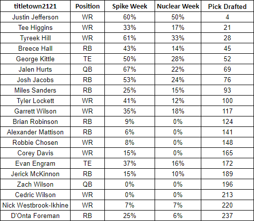 - – We must swing for the fences with each selection, guys like Van Jefferson will not help you on Drafters. Spike and nuclear weeks are what matter at every roster spot, playing for floor is pointless.