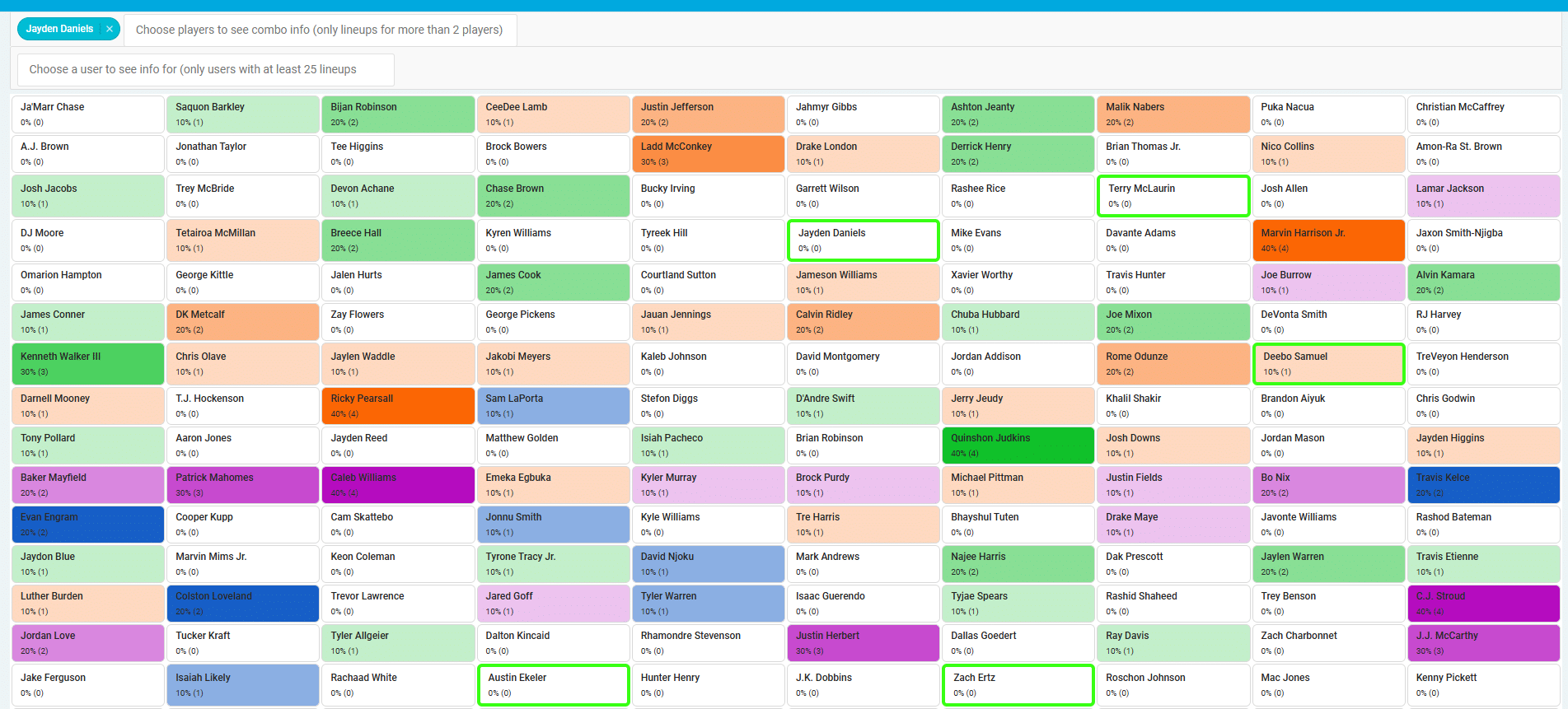 Combinatorial Ownership is going to give you massive leverage in this contest. It’s not just about how often a single player is drafted — it’s about how often specific combinations of players appear together on rosters. For instance, Saquon Barkley has been paired with Jakobi Meyers in 75% of drafts! That is laugh out loud funny in many ways. I cannot recommend using TournamentDB enough while drafting. Access to TournamentDB is available via Spike Week Premium. Since only 150 players are drafted in each room and there are so many possible team constructions, even common players can become part of incredibly unique builds when paired with less-drafted options. By being intentional about how your players overlap with others in the field, you can build teams that are both high-upside and hard to duplicate, increasing your chances of standing alone at the top when it matters most. Using the Draft Board and Common Combos will provide insights about what your competition is doing. Are you going to be the first person to draft Nico Collins and Brian Thomas Jr. together? I’ll also be very keen on identifying which QB’s are and aren’t paired together often.