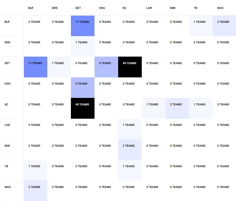 - Roster Spot Allocation: This can be anywhere from 0-50% of your roster. Wait, what? 50%?! Yes, this was actually my primary strategy on DraftKings last season. At first glance this seems inconceivable, but I’ll probably do it again this year if I believe the AFC team is a reasonable team to make the Super Bowl. 40 of 59 teams I drafted in the DraftKings main contest were Detroit vs Kansas City, this view is provided in DraftIQ > Playoff Combos. It is one of the primary tools I use to make sure my portfolio matches my macro strategy.