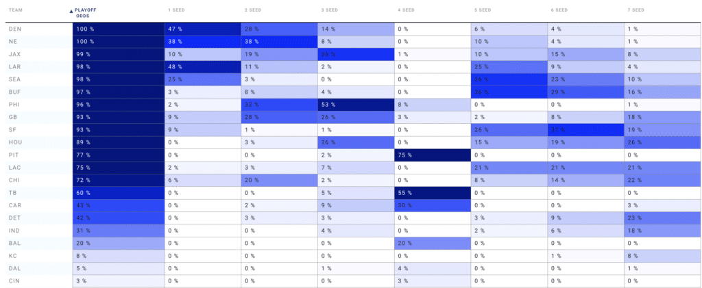 What a brutal week for the Colts, and we now have them as large dogs to make the playoffs. Their schedule is tough the rest of the way, and of course they lost Daniel Jones to an achilles injury. But it wasn’t any better for the Chiefs, who are effectively eliminated from the playoffs. They would need to run the table (Chargers and Broncos matchups make that very tough) and get some serious good luck, and they’re dealing with their own serious offensive line injuries.